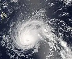 Located on the southwestern periphery of a subtropical ridge situated over southwestern Mexico, Flossie tracked generally west-southwestward after formation while intensifying.[2] Upper-level outflow began to expand in all quadrants of the cyclone and spiral bands became prominent around the center on August 9.[3] An eyewall and associated mid-level eye-feature was observed on microwave imagery, but was obscured on conventional satellite imagery, that evening.[4] Following a series of satellite intensity estimates and the presence of an eye on visible and infrared satellite imagery, Flossie was upgraded to a Category 1 on the Saffir–Simpson hurricane wind scale at 1200 UTC on August 10.[1] Despite forecasts of an increasingly unfavorable environment as the cyclone moved towards the Hawaiian Islands, Flossie continued to intensify. The hurricane unexpectedly began a period of rapid deepening during the overnight hours of August 10, and by 0600 UTC on August 11, Flossie attained major hurricane intensity – a Category 3 hurricane – with a quickly falling barometric pressure. Early morning satellite images revealed a 15 nmi (28 km) eye with cloud tops cooler than −75 °C (−103 °F) surrounding the feature.[5][6] Further intensification ensued as the storm entered the Central Pacific Hurricane Center (CPHC)'s area of responsibility that morning, and Flossie was upgraded to a Category 4 hurricane by 1200 UTC. Two hours later, the cyclone attained its peak intensity with maximum sustained winds of 140 mph (220 km/h) and a minimum barometric pressure of 949 mb (hPa; 28.02 inHg), the strongest tropical cyclone of the 2007 Pacific hurricane season.[1]
