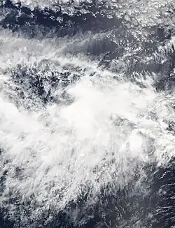 Roughly 36 hours later, the remnants of Genevieve regenerated into a tropical depression to the southeast of the main Hawaiian Islands.[12] The system briefly became better organized on July 30, prompting the CPHC to forecast the storm would re-intensify into a tropical storm.[13] However, by the end of the day, the low-level circulation center had become displaced to the east of the deep convection due to increased southeasterly shear[14] and infiltration of dry air.[15] By 21:00 UTC July 31, the CPHC reported that Genevieve had once again degenerated to a remnant low, as only an isolated area of deep convection remained west of the center.[16]