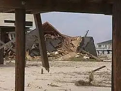 Upon making landfall, storm surge heights along the coast of Alabama were estimated to have ranged from 7 to 12 ft (2.1 to 3.7 m), with a peak of 11.9 ft (3.6 m) in Fort Morgan, along with 25 ft (7.6 m) waves on top of it.[1][61] Along the coastline, heavy rainfall and strong waves caused extensive property damage. In Gulf Shores, 251 houses, 16 apartment buildings, and 70 businesses experienced significant damage. On Dauphin Island, the hurricane damaged 80 houses and left around 40 uninhabitable.[49] Many waterfront homes on the western side of the island were pushed into other homes or strewn into pieces across the sand. Some roads were completely washed away. In Orange Beach, two condominiums were heavily damaged, one by fire and the other by high waves. Extensive storm surge flooding also occurred along Mobile Bay. With storm surge of 8.0 ft (2.4 m) at Mobile Bay Causeway, a number of businesses near the bridge were damaged.