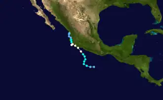 Thirty-six hours after formation, on October 1, a tropical storm warning was issued from Acapulco, to Manzanillo. Early on the following day, a hurricane watch was put into effect from Zihuatanejo, Guerrero, to Manzanillo, . Three hours later, the watch was upgraded to a hurricane warning. At 1500 UTC on that same day, a tropical storm warning was issued from Manzanillo, to San Blas, Nayarit. By 0300 UTC on October 3, the hurricane warning was extended from Cabo Corrientes, Jalisco to San Blas; the tropical storm warning was also extended, and included areas between Mazatlán and San Blas.[2] As the storm rapidly weakened inland, all watches and warnings in effect were discontinued midday on October 3.[16] In addition to these warnings, several ports and harbors were closed in the states of Guerrero, Michoacan, Jalisco, and Colima, a span of some 680 mi (1,095 km).[17]