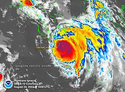 Hurricane Ignacio was the latest-forming first hurricane of a Pacific hurricane season since reliable satellite observation began in 1966. The ninth tropical storm of the 2003 Pacific hurricane season, Ignacio developed out of a tropical wave on August 22 a short distance off the coast of Mexico. It was initially predicted to track out to sea and remain a weak tropical storm, though it unexpectedly organized rapidly to attain peak winds of 105 mph (169 km/h) on August 24 while located a short distance southeast of southern Baja California Sur. Land interaction weakened Ignacio to an 80 mph (130 km/h) hurricane by the time it made landfall near La Paz, and it dissipated on August 27 in the central Baja California peninsula.