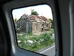 Power was lost throughout Grand Turk Island, an estimated 80%–95% of the houses there were damaged, 20% of which was a total loss.[1][26][46] There was also significant structural damage to roofs and buildings containing health services resulting in the disruption of most health services.[26] The local pharmacy roof collapsed, destroying the area's prescription drug supply, the police station, and the prison was significantly damaged and local supplies facilities were either damaged or destroyed.[26] A two-year-old cruise ship terminal on Grand Turk owned by Carnival Cruise Lines was significantly damaged.[1] Water and electricity were also disrupted but since have been restored. Meanwhile, in South Caicos, 95% of the houses were also damaged, with over one-third significantly damaged or destroyed. Damage also occurred on other islands, mostly agricultural or the fishing industry, but in general, the damage was minor.[1]