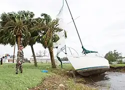 A U.S. Navy member assesses a damaged sailboat in Jacksonville, Florida