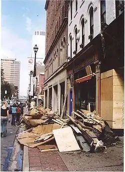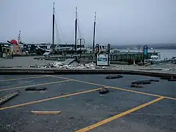 Damage was also reported in Prince Edward Island as a result of the storm, particularly around Charlottetown, where its waterfront sustained heavy wave damage to pleasure craft and sea walls, as well as significant damage to the older urban forest in that city's downtown core. Extensive tree damage was also reported across the island, as well as structural damage to weaker buildings, such as barns and silos.[3] The hurricane left portions of the island without power.[29] The narrow path meant that damage was quite localized; little damage was reported in New Brunswick or western Prince Edward Island.[30] Voting in the PEI general election on September 29 was also disrupted, though more than 80% of voters made it to polling stations.[31]