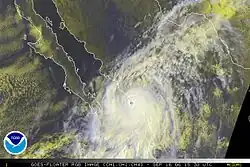 Lane continued to become better organized, with deep convection developing into a central dense overcast and well-defined outflow in the western half of the storm.[7] Late on September 14, an eyewall began to develop a short distance off the Mexican coastline.[8] Lane continued to strengthen as it turned more to the north-northwest, a motion caused due to the storm moving around the western periphery of a mid-level ridge over Mexico.[9] Based on reports from Reconnaissance Aircraft, Lane was upgraded to hurricane status on September 15, about 40 miles (64 km) west-northwest of Cabo Corrientes, Jalisco.[10] Subsequently, it quickly strengthened, and by six hours afterward, it attained winds of 105 mph (169 km/h), becoming a Category 2 hurricane on the Saffir–Simpson scale. Later that day, the 10 miles (16 km) wide eye crossed over the Islas Marías.[11] Early on September 16, Lane strengthened into a 115 mph (185 km/h) hurricane, just 50 miles (80 km) off the coast of Mexico, becoming the sixth major hurricane of the season.[12]