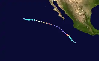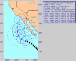 Shortly after reaching peak intensity, Hurricane Linda passed near Socorro Island as a Category 5 hurricane.[5] Around that time, tropical cyclone forecast models suggested that the hurricane would turn toward southern California due to an approaching upper-level trough.[1][6] Had Linda struck the state, it would have been much weaker at that time,[1] possibly moving ashore as a tropical storm.[3] Instead, Hurricane Linda turned west-northwestward away from land in response to a building ridge to the north of the hurricane.[1] Despite remaining away from land, moisture from the storm reached southern California to produce rainfall.[3] On September 14, the Hurricane Hunters and airplanes from National Oceanic and Atmospheric Administration investigated the hurricane to provide better data on the powerful hurricane.[5] Hurricane Linda quickly deteriorated as it tracked toward cooler waters, weakening to tropical storm status on September 15. Two days later, when located about 1,105 miles (1,778 km) west of the southern tip of the Baja California peninsula, it weakened to tropical depression status. Linda no longer met the criteria for a tropical cyclone by September 18, although its remnant circulation persisted for a few more days before dissipating.[1]