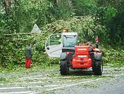 Passing 30 mi (48 km) off the northern shorelines, Maria brought torrential rainfall and strong gusts to Martinique but spared the island of its hurricane-force windfield,[57] which at the time extended 25 mi (40 km) around the eye.[58] The commune of Le Marigot recorded 6.7 inches (170 mm) of rain over a 24-hour period.[59] By September 19, Maria had knocked out power to 70,000 households, about 40% of the population.[60] Water service was cut to 50,000 customers, especially in the communes of Le Morne-Rouge and Gros-Morne.[57][61] Numerous roads and streets, especially along the northern coast, were impassible due to rock slides, fallen trees and toppled power poles.[61][60] Streets in Fort-de-France were inundated.[57] In the seaside commune of Le Carbet, rough seas washed ashore large rocks and demolished some coastal structures,[57][62] while some boats were blown over along the bay of the commune of Schœlcher.[63] Martinique's agricultural sector suffered considerable losses: about 70% of banana crops sustained wind damage, with nearly every tree downed along the northern coast.[64] There were no deaths on the island, although four people were injured in the hurricane—two seriously and two lightly.[61] Agricultural loss were estimated at €35 million (US$42 million).[39]