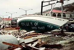 The highest reported gusts were 129 mph (208 km/h) in a Noncommissioned Automated Surface Observing System and 95 mph (153 km/h) gusts in Sailboat Puffin at Green Cay. The highest sustained winds were 105 mph (169 km/h) in a Noncommissioned Automated Surface Observing System.[3] Marilyn was directly responsible for seven deaths, most due to drowning on boats or offshore. Ten thousand people were left homeless on St. Thomas, and most buildings sustained some damage.[3]