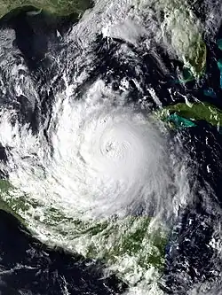 ![]() Roxanne shortly before landfall on the Yucatan Peninsula, near peak intensity, on October 10 | |