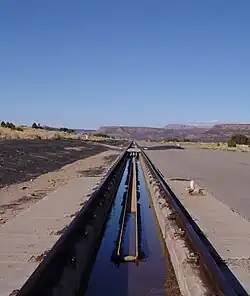 The track's 12,000 ft (3,700 m) "of continuously welded, heavy-duty crane-rails aligned to within plus or minus one-tenth inch tolerance [was] the longest" in the US (cf. the shorter 1954 Holloman Rocket Sled).[1] Coleman Engineering Company was contracted for $2 million in June 1954[2] and constructed the Supersonic Military Air Research Track (SMART), mechanical arresting gear (water brakes with 34 tons of force), retro rockets, and photographic/telemetering facilities. Coleman was also contracted for operations on November 30, 1955,[1] and achieved a "world land speed record [using] a 9,400-pound sled rocketing down the track at 1,800 miles per hour." The numerous test facilities included a powered comparator for high-speed motion pictures, a 1956 IBM 706 computer, and 1960 Bendix G-15 computer. Control of the site transferred from Indian Springs Air Force Base on November 6, 1957, and from Wright-Patterson AFB to Edwards AFB on March 9, 1962[3]—the base was placed on standby in December 1961,[1] and was closed on June 20, 1963.[3]