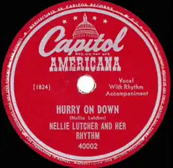 "Hurry on Down" is a song written and sung by Nellie Lutcher with backing on the record by a group called "Her Rhythm". Lutcher also played the piano on the record which was released in 1947 on the Capitol Americana label (catalog no. 40002). It debuted on the Billboard magazine's race records chart on August 16, 1947, peaked at No. 2, and remained on the chart for 18 weeks.[2] It was ranked No. 10 on the magazine's year-end list of the most played race records of 1947.[3]
