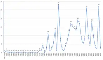 A study conducted by David Bandurski as part of the China Media Project at the University of Hong Kong selected 143 text samples of the phrase from excerpts from the People's Daily published between 1959 and 2015; from this sample, Japan was most frequently accused of "hurting the feelings of the Chinese people" with 51 occurrences, while the United States ranked second at 35 occurrences. In terms of specific issues which drew condemnation through the catchphrase, 28 were in relation to the political status of Taiwan, while the Tibetan sovereignty debate drew condemnation with the phrase 12 times.[4] Bandurski later wrote in 2019 that the phrase appears around at most four times in the People's Daily each year, though there was a slight uptick in 2012.[23]