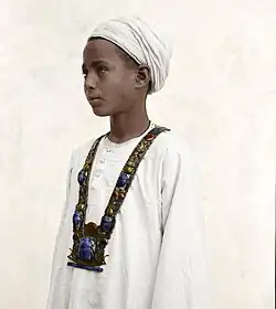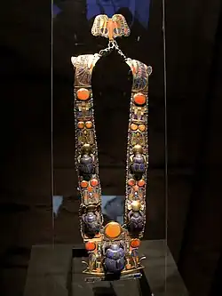 ![]() Hussein wearing Tutankhamun's necklace (12 years old) | |