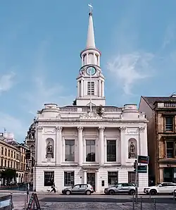The current building was constructed, as Hutchesons' Hospital, between 1802 and 1805 to a design by the Scottish architect David Hamilton. This building was to replace an earlier hospital of 1641 in the city's Trongate, which needed to be removed to created Hutcheson Street. Hamilton's design incorporates in its frontage statues (carved in 1649 by James Colquhoun) from this earlier hospital.[3]
