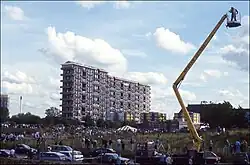 The blocks were popularly known as 'Hutchie C' and nicknamed 'The Hanging Gardens of the Gorbals' in reference to the large balconies arranged in groups of four throughout the building. For the first ten years the building was reasonably popular with its inhabitants, particularly in comparison with the conditions they had endured in the dilapidated tenements,[8] although the reality of the 'ship in full sail' was that washing frequently blew away when hung out at such heights, while doors and windows were also subject to wind damage. Tenants and pedestrians also complained of high winds near the base of the buildings (caused by the venturi effect – common when tall buildings are grouped closely together) which were reportedly strong enough to literally "lift you off your feet". However, life in the building proved to be less popular over time because the maintenance required for such a large and complex structure had been underestimated from the beginning. By November 1976, the local MP Frank McElhone, councillors and Scottish Office officials, attended a meeting called by the Laurieston and Hutchesontown Tenants' Associations, which pressed for a solution to the problems of damp and fungus in the buildings, water running down the walls and water beetles lodging in children's clothing. Several tenants had been following a rent strike for a year to get action from Glasgow District Council.[9] The future of the blocks was a major issue in the 1982 by-election in the Glasgow Queen's Park burgh constituency, which covered the site.[10]