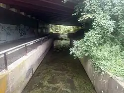 At the 65-acre (26 ha) V-shaped lake the Hutchinson has descended to 184 ft (56 m).[20] It flows out through a narrow spillway on the lake's southeastern shore, crossing under a footbridge and then immediately bending southwest[21] to begin several miles of closely paralleling the Hutchinson River Parkway, a four-lane limited-access grade-separated highway. The river goes through a series of culverts under the ramps of the parkway's Mill Road exit immediately to the south.[22] While still flowing close by the parkway, it enters the mostly wooded Twin Lakes County Park, the least developed area it has flowed through by this point.[23]