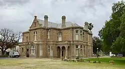 Rymill House and Coach House, at no. 40 Hutt Street on the corner with Flinders Street, is on a large block that extends to East Terrace. It had its beginnings in the plot of land purchased by brothers Henry and Frank Rymill, who were financiers, in 1859. They first had a small cottage built on the land, designed by George Strickland Kingston, which was completed in 1860. After some years, Henry bought out Frank's share and had the cottage demolished. The present building was constructed in 1881 or 1884[14] to the design of John Haslam. It was called "The Firs", although the surrounding trees were actually Aleppo pines. It was described as being in the Queen Anne architectural style, built using brown stone and Sydney stone.[15] The house's heritage statement includes: "it is one of the largest and most prominent 19th century park lands mansions for which Adelaide has been renowned".[14]