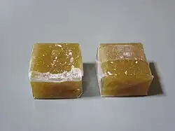 Hyōrokumochi (兵六餅) is a candy which is made and sold by Seika Foods in Kagoshima. Similar to a rice cake, it is made of maltose starch syrup, nori, powdered green tea, soybean flour, and white bean paste. It is shaped into a small cube and wrapped in a thin film of edible starch. Hyōrokumochi can be bought at stores throughout Kyushu.[1]