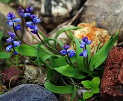 Hyacinthella species grow from bulbs whose tunics often bear powdery white crystals. There are usually two or three basal leaves with prominent strands of fibre. The inflorescences consist of short spikes (racemes) of tubular flowers, each with six short lobes, in colours ranging from pale blue to deep violet.[4] Heights vary from about 5 cm (2 in) to 25 cm (10 in), depending on the species.[5] They grow in rocky habitats, such as hillsides, which are hot and dry in the summer.[4]