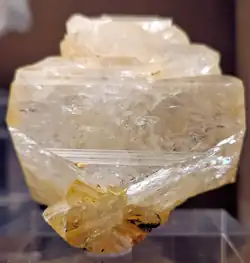 Hyalophane or jaloallofane is a crystalline mineral, part of the feldspar group of tectosilicates. It is considered a barium-rich potassium feldspar.[5] Its chemical formula is (K,Ba)[Al(Si,Al)Si2O8], and it has a hardness of 6 to 6+1⁄2. The name hyalophane comes from the Greek hyalos, meaning "glass", and phanos meaning "to appear".[4]
