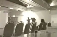 Behind Bars was a theatre piece performed as part of Hull Literature Festival 1997. A series of three related poems performed by a single actor it involved a soundscape and video projection to create the scenic space. It was performed in Hull Truck Theatre. Riot is Paradigm was another project performed as part of the same festival. Involving a collaboration with dancers, sound and video artists it was a multi media piece performed in the Ferens Art Gallery, Hull and described as a 'cinematic experiment in our perception of space'.[9] In both these projects the idea of developing a ‘hybrid’ space through the use of video in conventional theatrical and gallery settings was a development of the ideas first implemented in single stream video films and their large scale projection as installations. In Behind Bars and Riot is Paradigm Hybrid Artworks continued with the incursion of installation into conventional settings but also added an element of ‘live performance’; a feature considered typical of installation and performance.[10] In both cases, actors performed live alongside the projected image. In this regard the precedents used by Hybrid Artworks were multiple and included groups and artists like Bill Viola,[11] Bruce Nauman,[12] Gary Hill[13] and Dan Graham,[14] to name but a few. From a more performance and video background Hybrid Artworks referenced the work of Station House Opera as an important influence.[15]