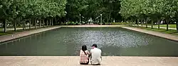 Civic monuments were thought appropriate and two of the most successful of the period were attracted – the Archibald Fountain at the northern end and the Anzac Memorial (1930–34) at the southern end: an inspired Art Deco monument of blocky, buttressed forms. With fine sculptures under English migrant sculptor Raynor Hoff's direction, its symbolism departed from neo-classical forms used in many war memorials and incorporated symbols special to Australia – such as the rising sun and figures of brooding servicemen- which gave the monumental strength to the large granite sculpture.[11] Its modernity and the emphasis (sculpture and friezes) on women, made it controversial. Photographer Harold Cazneaux depicted its new setting, "Pool of Reflection" and lines of then Lombardy poplars (Populus nigra 'Italica') in 1934.[41][1]