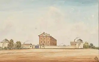 The accommodation soon proved inadequate and up to 1400 men were housed in the Barracks at any one time. It has been estimated that perhaps 30,000 men and boys passed through the Barracks between 1819 and 1848.[13] The convict response to the Barracks was somewhat mixed: those that were able to pay for lodgings by working on Saturday were not happy about the confinement; others were happy to have a roof over their heads. In 1820, in order to ease the pressure on the crowded Barracks the reward of being allowed to live outside the Barracks was extended. Convicts found gambling, drunk, engaged in street violence, or other unseemly behaviour had this freedom revoked and were sent to live in the Barracks. It had become a form of punishment. Loitering or idling on a Saturday was also punishable by confinement to the Barracks. Convicts had a peculiar mix of detention and freedom, convicts had to work for the Government during the week, but were allowed to work for their own benefits on Saturdays. This was a privilege Governor Macquarie did not like to see abused.[7]