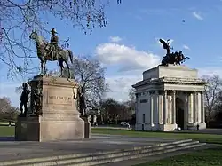 The traffic island includes a smaller equestrian statue of Wellington by Joseph Edgar Boehm—unveiled in 1888—the Machine Gun Corps Memorial, the Royal Artillery Memorial, the Australian War Memorial and the New Zealand War Memorial.