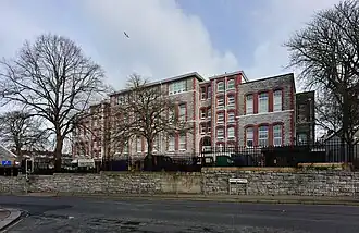 The school building was designed by Henry John Snell (1843–1924), who was responsible for a number of Plymouth's 19th-century buildings.[4] Hyde Park was the last school designed and built by the Plymouth School Board before the local authority took over responsibility for education in 1903, and it was officially opened by the Mayor of Plymouth on 27 May 1904. Upon opening the school had the capacity for 512 infants on the ground floor, 480 girls on the first floor and 430 boys on the third floor as well as two classrooms in the basement and a large playground with covered sheds.[5]