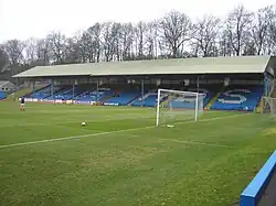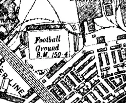 For certain areas of the ground few photographs survive, however, a map dating from 1894 indicates that most of the terracing was of uneven shape, and that unusually, a section of railway line leading to a neighbouring boilerworks ran between the terrace and the pitch at one corner of the ground. The main grandstand (the "Main Stand") was situated at the north of the ground. Built in 1889 for £1,500, this structure replaced the original 1,000 capacity grandstand which had been built in 1888. The new grandstand comprised an upper tier of seating and a lower paddock. Most contemporary sources listed the capacity as 4,000, though it is unclear whether this refers to the seating capacity or the total capacity.[23] The wooden stand was gutted by fire in 1920, causing the loss of both the stand and the club records, which were stored within.[3]