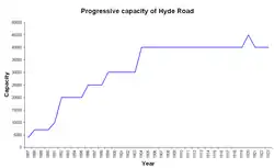 The increasing popularity of the football club resulted in improvements being made to the ground on several occasions. Improvements costing £600 were made in 1890, and changing rooms were provided in 1896.[8] A new stand was purchased for £1,500 in 1898, and £2,000 worth of improvements were made in 1904, resulting in a capacity of 40,000 with stands on three sides.[9] This development resulted in Hyde Road being chosen to host two prestigious matches—an inter-league match between the English League and the Irish League, and an FA Cup semi-final between Newcastle United and The Wednesday.[10] In 1910 multi-span roofing was built on the three previously uncovered sides of the ground, resulting in covered accommodation for 35,000 spectators.[11]