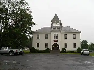 The Hydeville School stands in the village of Hydeville in western Castleton. It is set on the south side of Route 4A, between School Street and Blissville Road. It is a two-story wood frame structure, with a hip roof, clapboard siding, and a slate foundation finished in concrete. The most prominent feature is a projecting three-story tower, which has pilastered corners, the main entrance set in a round-arch opening, and an open belvedere beneath a flared pyramidal roof. The interior retains significant amounts of original finish, including woodwork in the stairwells and classrooms.[2]