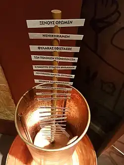 {{cite book}}: CS1 maint: location (link) - ^ Kulikova, Milena. Antique hydraulic telegraph: refinement of the data transfer rate in Ancient Greece by an experiment and a mathematical model, Eurasian Scientific Journal, 2024, #1, pp. 30–33.