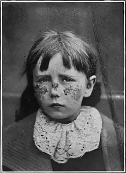 Hydroa vacciniforme (HV) is a very rare, chronic photodermatitis-type skin condition with usual onset in childhood. It was first described in 1862 by Pierre-Antoine-Ernest Bazin.[1] It is sometimes called "Bazin's hydroa vacciniforme". A study published in Scotland in 2000 reviewed the cases of 17 patients and estimated a prevalence of 0.34 cases per 100,000 population. In this study they reported an average age of onset of 7.9 years. Frequently the rash first appeared in the spring or summer months and involved sun-exposed skin.[2] The rash starts as a vesicular eruption, later becoming umbilicated, and results in vacciniform scarring. It is most frequently found on the nose, cheeks, ears, dorsum of the hand, and arms (places that are most exposed to light).[3]