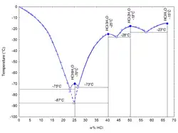 Hydrochloric acid as the binary (two-component) mixture of HCl and H2O has a constant-boiling azeotrope at 20.2% HCl and 108.6 °C (381.8 K; 227.5 °F). There are four constant-crystallization eutectic points for hydrochloric acid, between the crystal form of [H3O]Cl (68% HCl), [H5O2]Cl (51% HCl), [H7O3]Cl (41% HCl), [H3O]Cl·5H2O (25% HCl), and ice (0% HCl). There is also a metastable eutectic point at 24.8% between ice and the [H7O3]Cl crystallization.[33] They are all hydronium salts.
