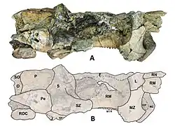 The species name "hesperotiganites", first published in 2022 in the journal Vertebrate Anatomy Morphology Palaeontology, translates to "western pancake" from the Greek words "hesperos" (western) and "tiganites" (pancake), chosen to reflect both the geographic location of the holotype skull as well as its crushed state.[1]
