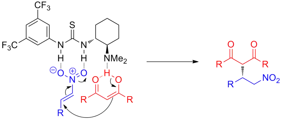 Since such a large number of catalysts and reactions involve binding to electrophiles to stabilize the transition state, many bifunctional catalysts also present a Lewis-basic, hydrogen-bond acceptor site. As a representative example, Deng and coworkers have developed a thiourea-amine catalyst capable of promoting stereoselective Michael reactions.[19] In the proposed transition state, one of the thiourea N–H donors is coordinated to the Michael acceptor and will stabilize the negative charge buildup. The basic nitrogen lone pair acts as a hydrogen-bond acceptor to coordinate the nucleophile, but in the transition state acts as a general base to promote the nucleophilic enolate addition.