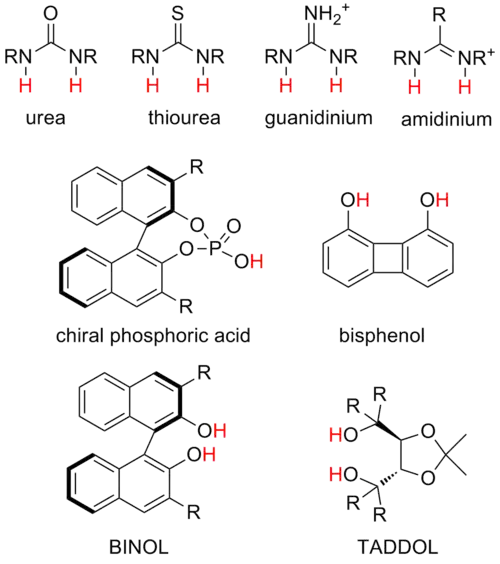 The types of hydrogen-bond donors used in catalysis vary widely from reaction to reaction, even among similar catalytic strategies. While specific systems are often studied and optimized extensively, a general understanding of the optimal donor for a reaction or the relationship between catalyst structure and reactivity is greatly lacking. It is not yet practical to rationally design structures to promote a desired reaction with the desired selectivity. However, contemporary hydrogen-bond catalysis is primarily focused on a few types of systems that experimentally seem to be effective in a variety of situations.[21] These are termed "privileged structures". However, it is worth noting that other structural scaffolds and motifs have also shown promising results, such as metal-coordinated hydrogen-bond donors.[22]