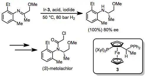 Imine hydrogenation provides a practical route to chiral amines.[16] Metolachlor is the active ingredient in the widely used herbicide Dual Magnum. A key step in its industrial production involves the enantioselective reduction of an N-aryl imine. This reduction is achieved with extremely high turnover number (albeit moderate enantioselectivity) through the use of a specialized catalyst system consisting of [Ir(COD)Cl]2, modified Josiphos ligand 3, and acid and iodide additives.[17]