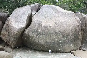 A bench mark is a point, at a known elevation above or below an adopted datum, marked on a durable object. Bench marks such as an upward-pointing broad arrow symbol (used to denote a government survey from 1852)[6] could be chiselled on a rock - as was the case at Bessie Point. Alternatively, metal disks could be attached to a rock, or to a concrete block. Often a horizontal line was cut, balanced on the point of the arrow, although only an arrow was cut at Bessie Point. Other examples of broad arrow bench marks cut into rocks exist at Bowen (1887), and at Princess Charlotte Bay in the Flinders group of islands (1899, by HMS Dart). In the case of the Bessie Point 1878 bench mark, which is cut into the largest boulder on the shoreline, the datum was low water ordinary spring tides, calculated as being 12 feet (3.7 m) below the broad arrow.[7] All water depths (in feet) on the map of Cairns Harbour made in 1878 thus represented the depth available at low water ordinary spring tides, that water level being 12 feet (3.7 m) below the bench mark. The tidal range for spring tides in the bay was 8–10 feet (2.4–3.0 m).[1]