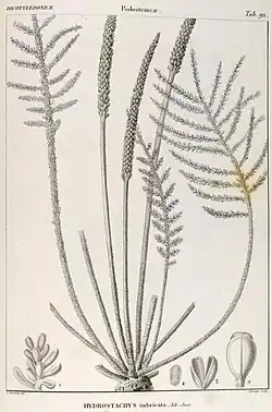Hydrostachys is a genus of about 22 species[2] of flowering plants native to Madagascar and southern and central Africa. It is the only genus in the family Hydrostachyaceae. All species of Hydrostachys are aquatic, growing on rocks in fast-moving water. They have tuberous roots, usually pinnately compound leaves, and highly reduced flowers on dense spikes.[3]