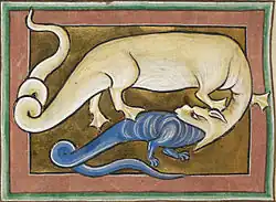 The Hydrus (also known as Enhydros, Enidros, Hildris, Hydra, Idra, Idres, Ydre, Ydris, and Ydrus) is a creature from Medieval bestiaries. They were said to be found in the Nile River. While in the Nile, a crocodile would roll the hydrus in the mud before eating the smaller creature. However, once inside the crocodile's stomach, the hydrus would burst free from the stomach lining. Another interpretation is that the hydrus would intentionally roll in the mud and seek out the crocodile while it slept with its mouth open.[1] In medieval Christian tradition, this bursting free from the crocodile became an emblem of the resurrection of Christ bursting free from Hell.[2]