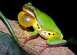 In terms of sexual selection, indirect selection refers to the selection of a specific trait based on its genetic correlation to overall fitness. H. arborea is a nocturnal species which depends on calling by males for female mate choice.[8][10] In addition to its ability to detect acoustic communications, H. arborea, as well as most other Anuran species, possess specialized visual systems that function particularly well in low light.[14] This visual system allows for detection of observable male traits that could factor into female mate choice. Research has shown that H. arborea females have a preference for males with more conspicuous vocal sac coloration.[14] It is postulated that this preference may assist in localization and detection of males by searching females. However, vocal sac pigmentation is dictated by carotenoid levels, which must be ingested through food intake.[14] Thus, the presence of conspicuous vocal sac coloration could in turn signal higher male foraging ability and fitness.[14]