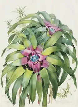 Margaret Mee was known for her paintings of bromeliads in the Amazon, and Hylaeaicum margaretae was one of the species she recorded in watercolor. Mee was the first to record the existence of the species, unknown to science and still unnamed at the time. The painting of H. margaretae, made in 1979, was notable for its ability to capture botanical details of the species while still showing the plant in its totality, rather than on different plates which depict individual parts.[6][7]