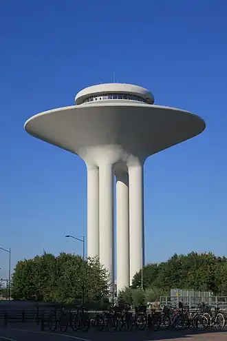 The Hyllie Water Tower, in the Hyllie district of the Swedish city of Malmö, was designed by the architect Karl Ivar Stål for Kjessler & Mannerstråle (now part of WSP Sweden) and completed in 1973. The tower is white and has the shape of a flying saucer. It is 62 metres (203 ft) high and holds 10,200 cubic metres (360,000 cu ft) of water. It is operated by the local water organisation for southeastern Skåne, VA SYD, and has a small public park at its base.