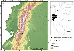 | Map showing the type locality of Hyloscirtus tolkieni at the Río Negro-Sopladora National Park, province of Morona Santiago, Ecuador. | |
