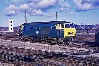 When first built, the Hymeks were given a more elaborate livery than many of the contemporary British Railways diesel classes. The main body of the locomotive was the standard dark Brunswick green, but with a lime green stripe along the bottom of the bodywork. The roof was medium grey, and the finishing touch was to paint the window surrounds in ivory white. In the early 1960s, yellow warning panels were added to the lower part of the front ends, in accordance with BR's then-new policy. With the advent of the Corporate Identity scheme in 1965[13] some locomotives received all-over BR Rail Blue with small yellow warning panels. This was quickly changed by the return of off-white window surrounds. The final variation was BR blue with full yellow ends, the yellow being extended around the cab side windows.