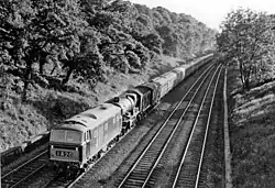 Hymeks were notably used as bankers on the Lickey Incline, propelling mainly freight trains from Bromsgrove to Blackwell. During trials, it was discovered that the Hymeks changed between first and second gear at about the speed required to bank a train up the incline, and so they tended to "hunt" between the two gears. Repeated gear changes under full power caused excessive wear and damage, plus excessive heat in the transmission fluid quickly resulted in the locomotive stopping. The simplest way to avoid excessive wear, and the stopping of a train on the incline, was to lock first gear out of action, via the master switch located in each locomotive's A-end cab.[7] With all Lickey bankers allocated to Worcester shed, the main group of five locomotives (D7021 - D7025) and any replacements were all turned on the Worcester triangle, so that the A-cab was always aligned up the incline. Once at the bottom of the incline, each train which required banking would be signalled to the banking locomotives by Gloucester Panel Signal Box, so that the banking crew could then determine if it was necessary to lock out first gear on one or more of the locomotives.[8] These banking operations commenced in 1969 and involved one, two or three locomotives with two locos set up to work in multiple plus an additional single locomotive (three in total) in operation on any given day. Particularly heavy trains such as the Llanwern to Immingham steel train required all three locomotives.[9]