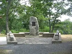 The monolith is at the head of a low, keystone-shaped concrete wall. On each of the two long sides of the keystone are ten stones, one for each of the twenty state forests in Pennsylvania. Each stone is a rough cube in shape and each was taken from its respective state forest.[1]