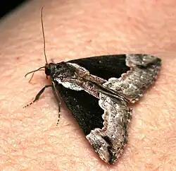 Adults have a wingspan of 26–32 mm (1.0–1.3 in) and rest with their hindwings tucked behind their forewings, giving them a triangular silhouette. The forewings are grayish-brown and females may have a lighter tint often absent in males. They have a large dark patch covering much of the outer sides of the forewings which extends to about 3/4ths of the length of the wings but does not expand to touch the inner margin. The inner margins and lower areas of the wings are mottled greyish-brown with a dark brown or black diagonal line extending inward from each corner. This is more visible in females.[1][2]